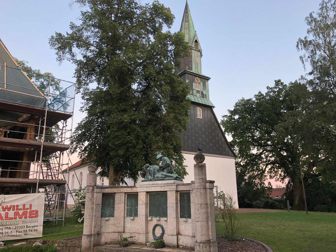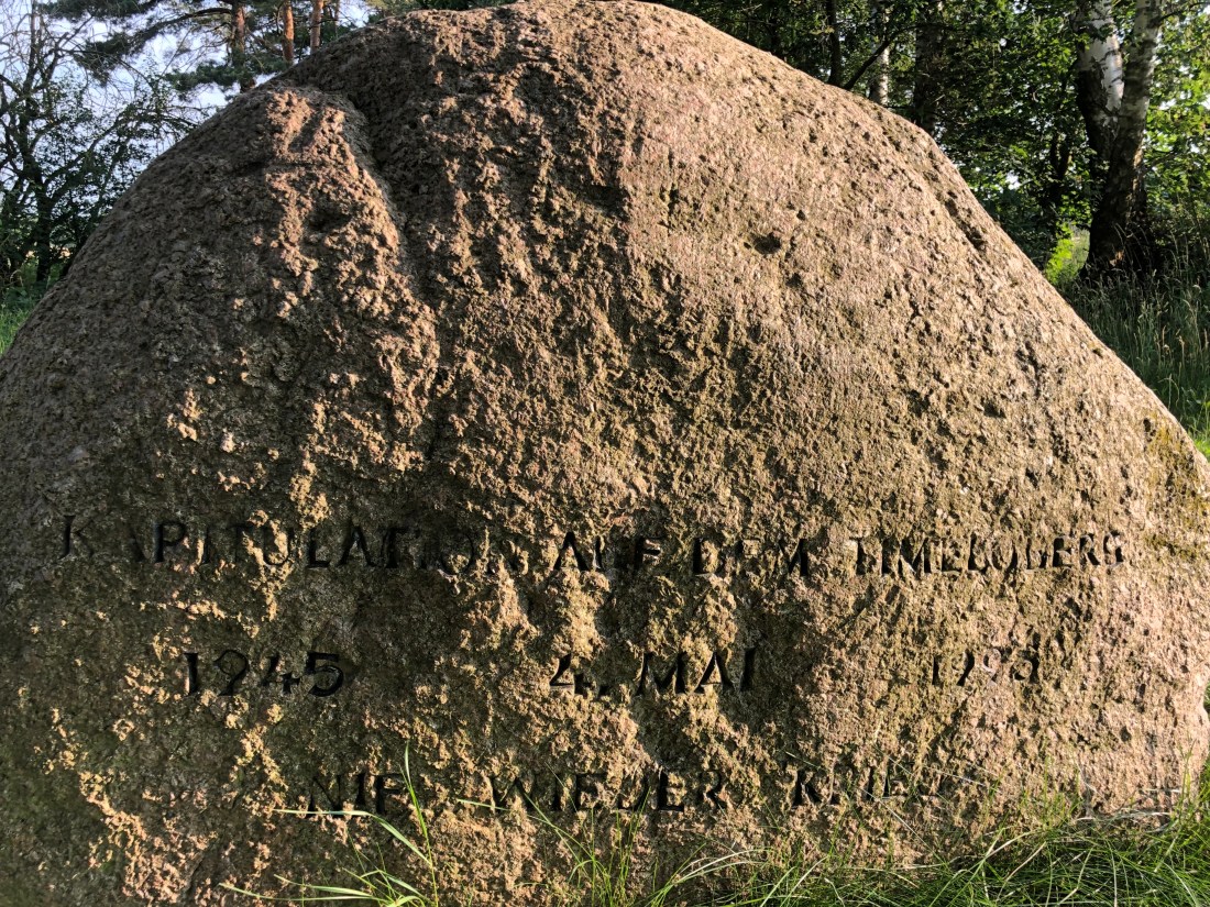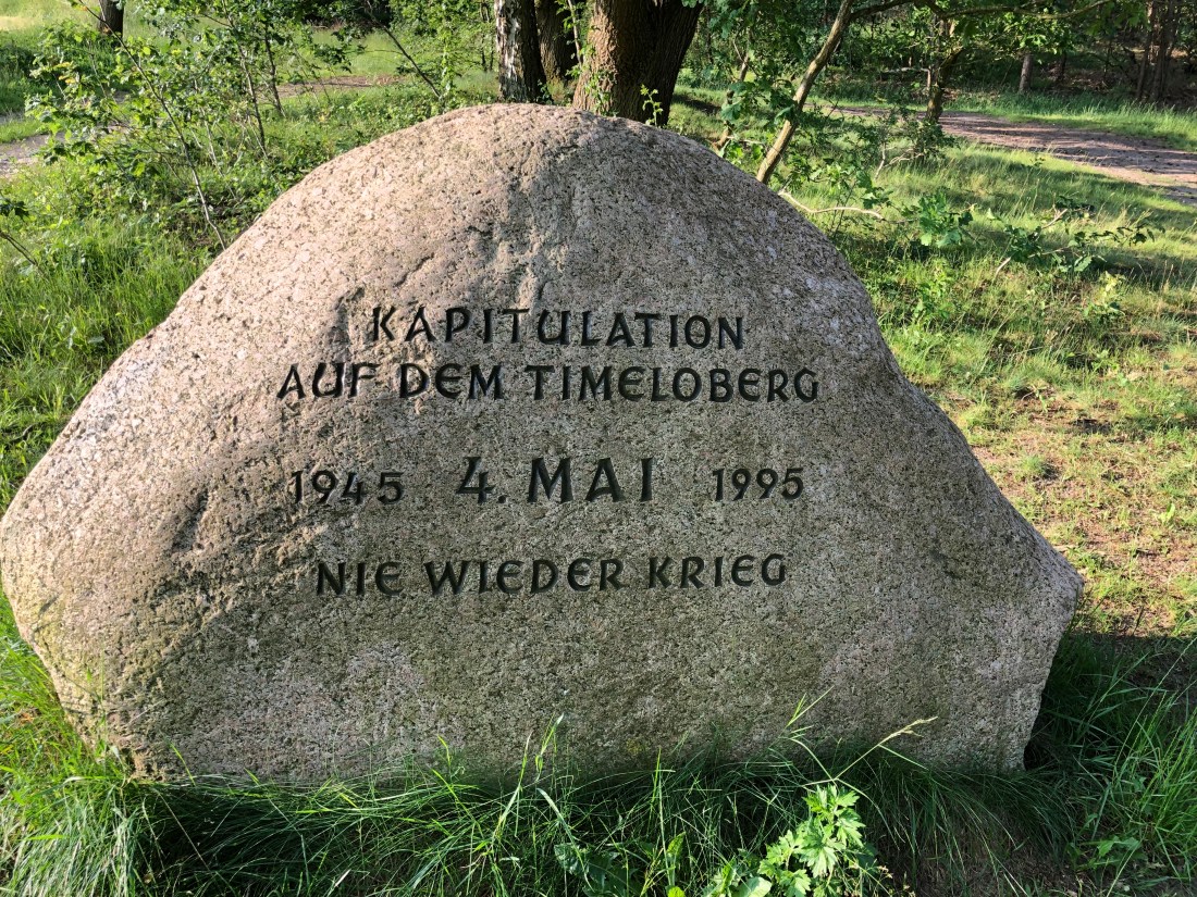 Today was even hotter. A 12-hour+, 90-mile journey to Havelberg made for an early start. A short detour led to the monument close to the site of the German Army’s surrender to Montgomery on 4 May 1945 on the Timeloberg, a shallow-rising hill outside Luneberg. The monument marks the end of the war between our two countries and the beginning of reconciliation, partnership and friendship, and is marked with a ceremony eatery 10 years. The original monument was moved to Sandhurst after being vandalised several times, and the site lies now in a militarised zone and is inaccessible. The present monument was overturned, damaging the inscription, and so when it was righted a new, identical inscription was made on the other side. The original words can just be made out.