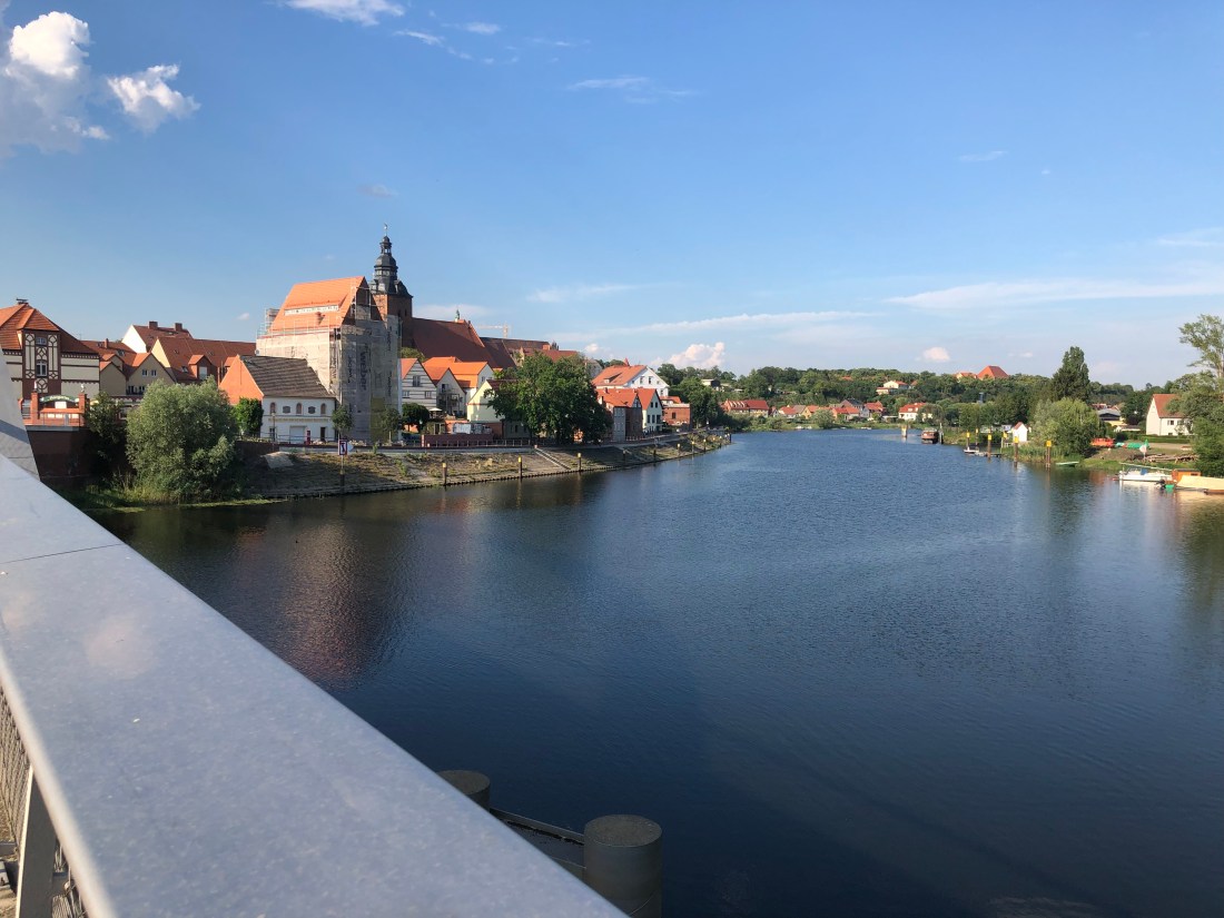 The heat rose into the mid-afternoon and was oppressive and debilitating. Progress towards the end was further slowed by an unpleasant local habit of switching from smooth roads to cobbles in villages further east. One such cobbled monstrosity ran for nearly 3 miles down to the ferry over the Elbe at Rabel, which was my first site of the river, a few miles short of Havelberg.